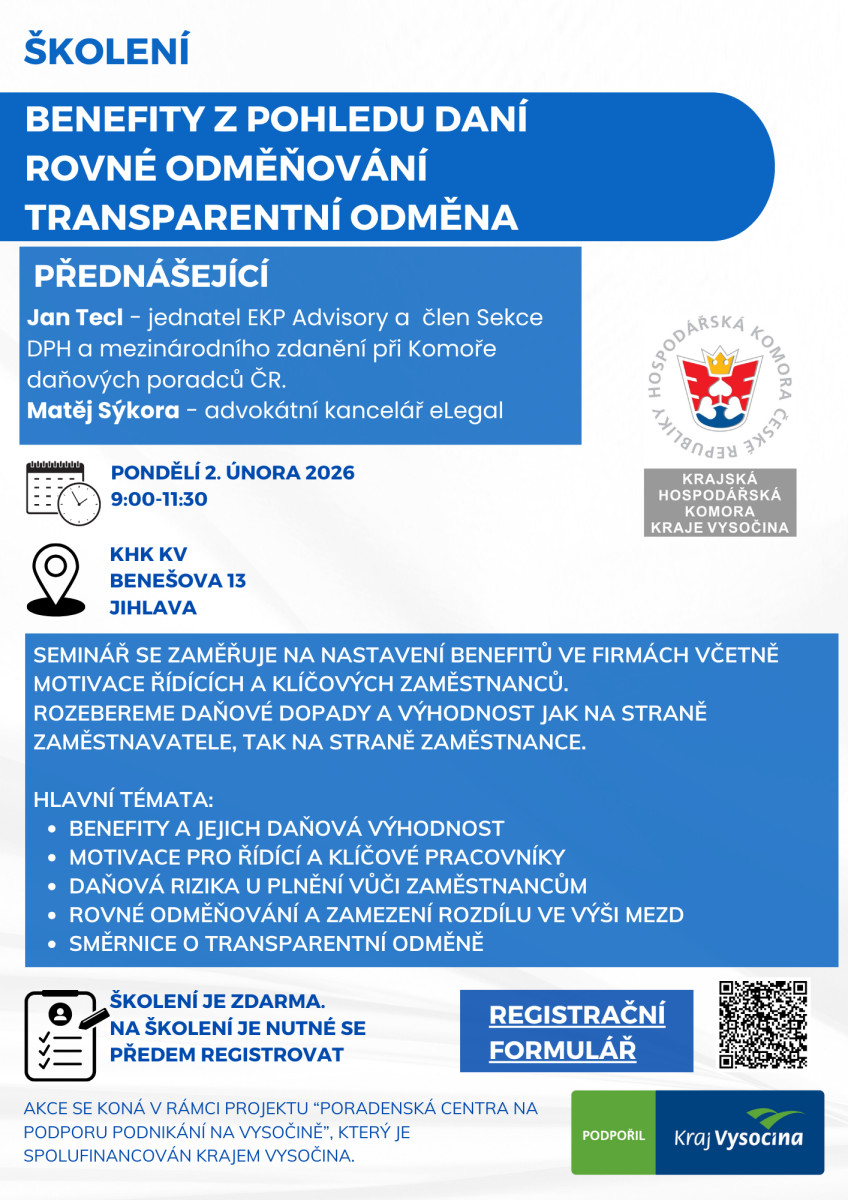 Zveme vás na seminář zaměřený na nastavení benefitů ve firmách, motivaci řídících a klíčových zaměstnanců a jejich daňové dopady z pohledu zaměstnavatele i zaměstnance.